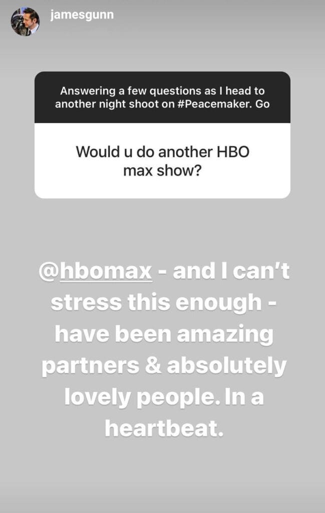 No puedo decirles cuánto aprecio a la gente de HBO Max. Su humanidad y apoyo a mi visión creativa en la serie #Peacemaker, a pesar de los numerosos obstáculos en el camino, es incomparable. Solo rezo para que el elenco, el equipo y yo seamos igualmente buenos compañeros.