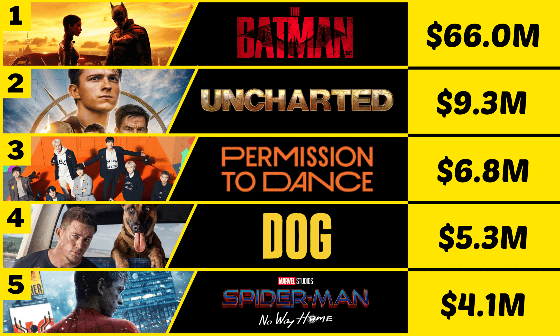 The Batman mantiene su reinado en la taquilla norteamericana, con cifras magníficas gracias en cierta medida a la escasez de nuevos estrenos y a su positiva recepción (Originalmente, este mismo fin de semana se iba a estrenar en salas la película de Pixar Red, que ha sumado $3,8M en su estreno internacional, pero finalmente ha llegado directamente a Disney+ en suelo norteamericano).
