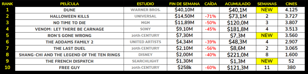 Dune consigue el mejor estreno híbrido de Warner Bros. durante el año 2021, por lo que se mantiene el gran momento en taquilla del mes de octubre.