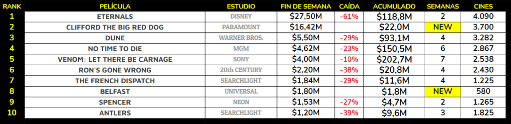 Eternals mantiene el liderato de forma holgada en su segundo fin de semana mientras Clifford da la sorpresa en 2º lugar.