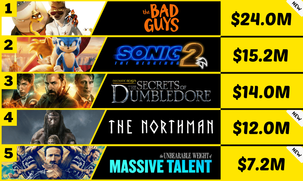 Animales Fantásticos: Los Secretos de Dumbledore pega un bajón en su segundo fin de semana. Cae al 3º puesto con un estimado de $14,01M (-67%), siendo la mayor caída de la saga y la 2ª contando las películas de Harry Potter. Su acumulado asciende a $67,1M, por lo que tendrá que pelear duro por llegar a los $100M finales.