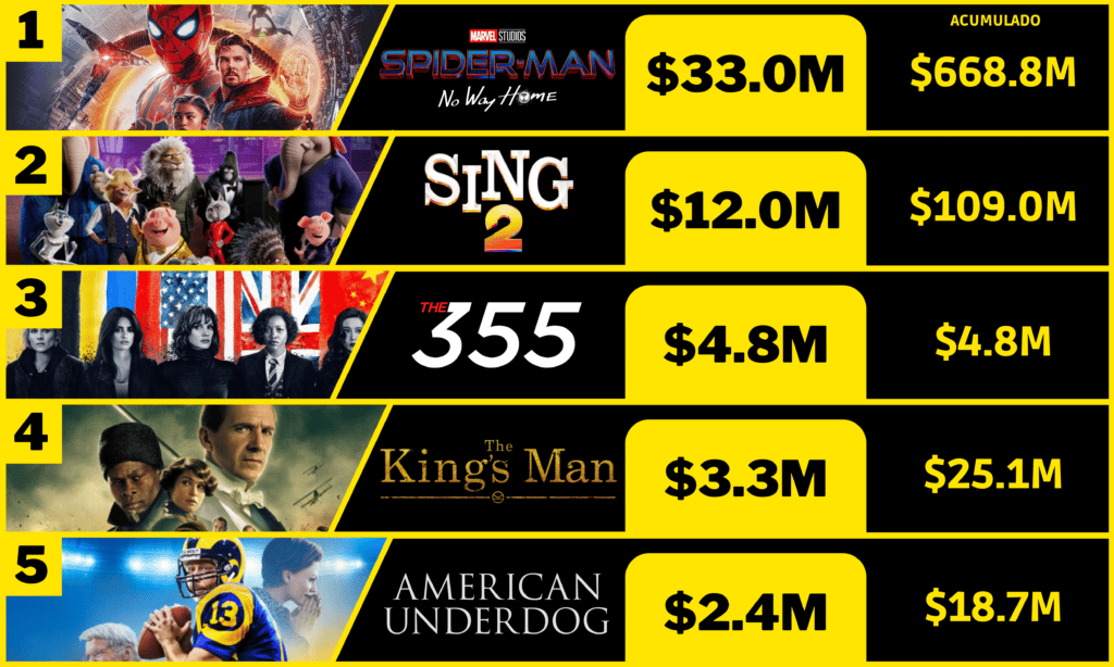 Spider-Man: No Way Home lidera por cuarto fin de semana consecutivo mientras ¡Canta 2! se mantiene con fuerza. Agentes 355 apenas causa impacto.