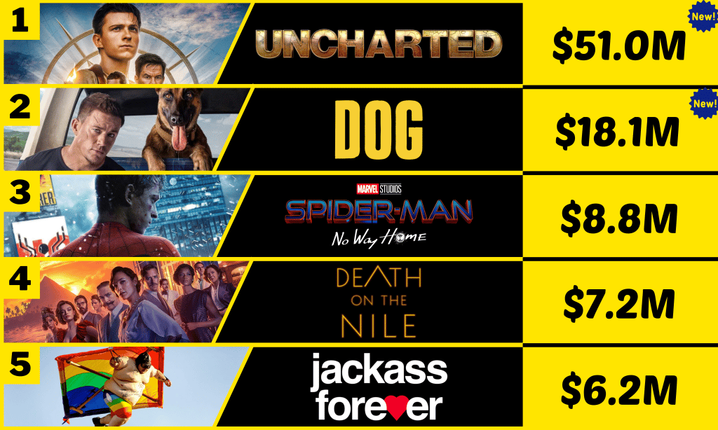 Uncharted da la sorpresa y consigue el mejor debut de lo que va de año, confirmando a Tom Holland como el actor del momento. Dog mejora las previsiones en 2º lugar.
