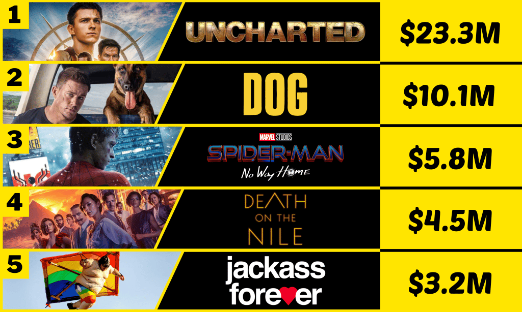 Uncharted lidera en su segundo fin de semana con unos destacables $23,25M (-47%), lo que la lleva a un acumulado de $83,4M tras 10 días. En este punto, un final de +$130M parece probable, aunque dependerá bastante de su desempeño cuando llegue The Batman.
